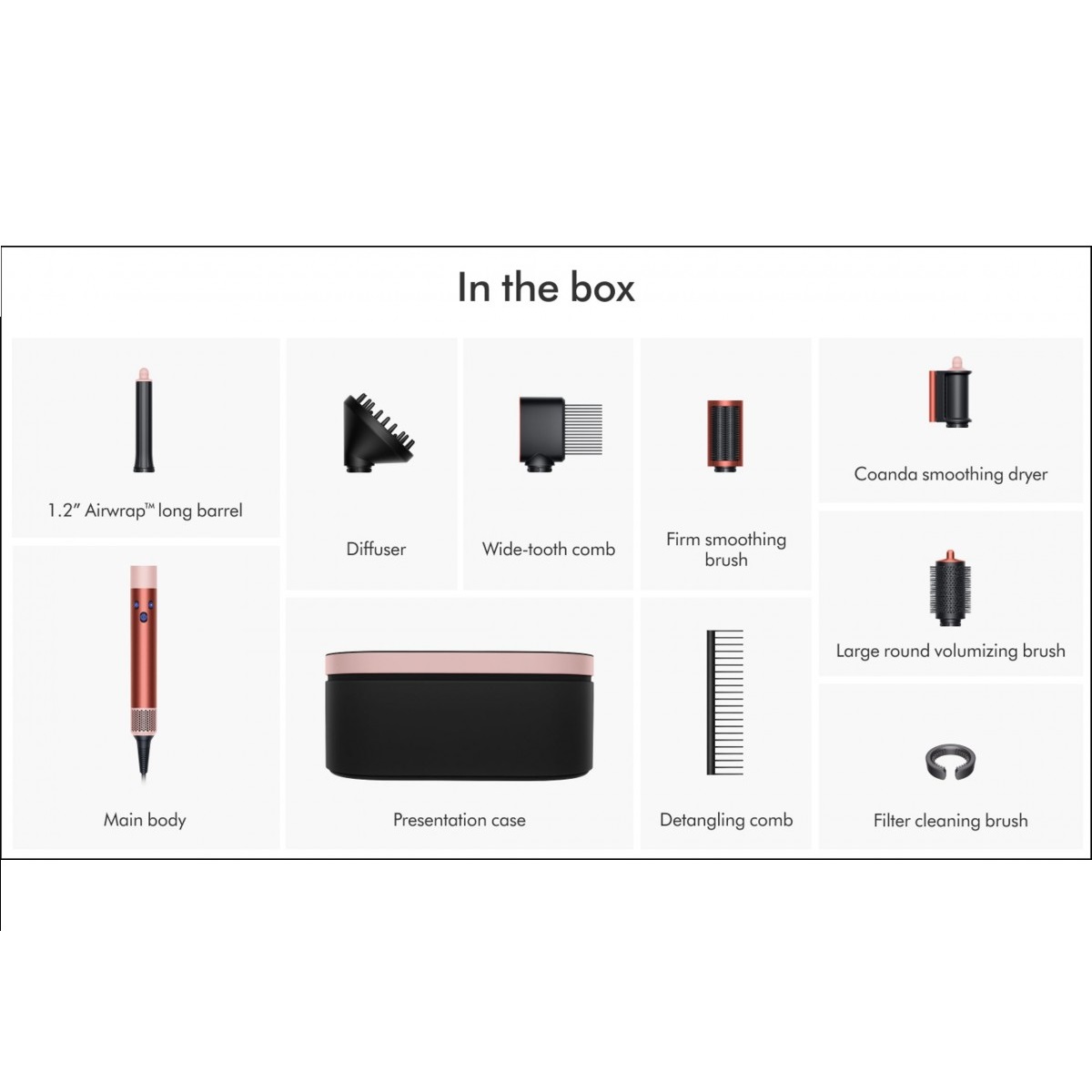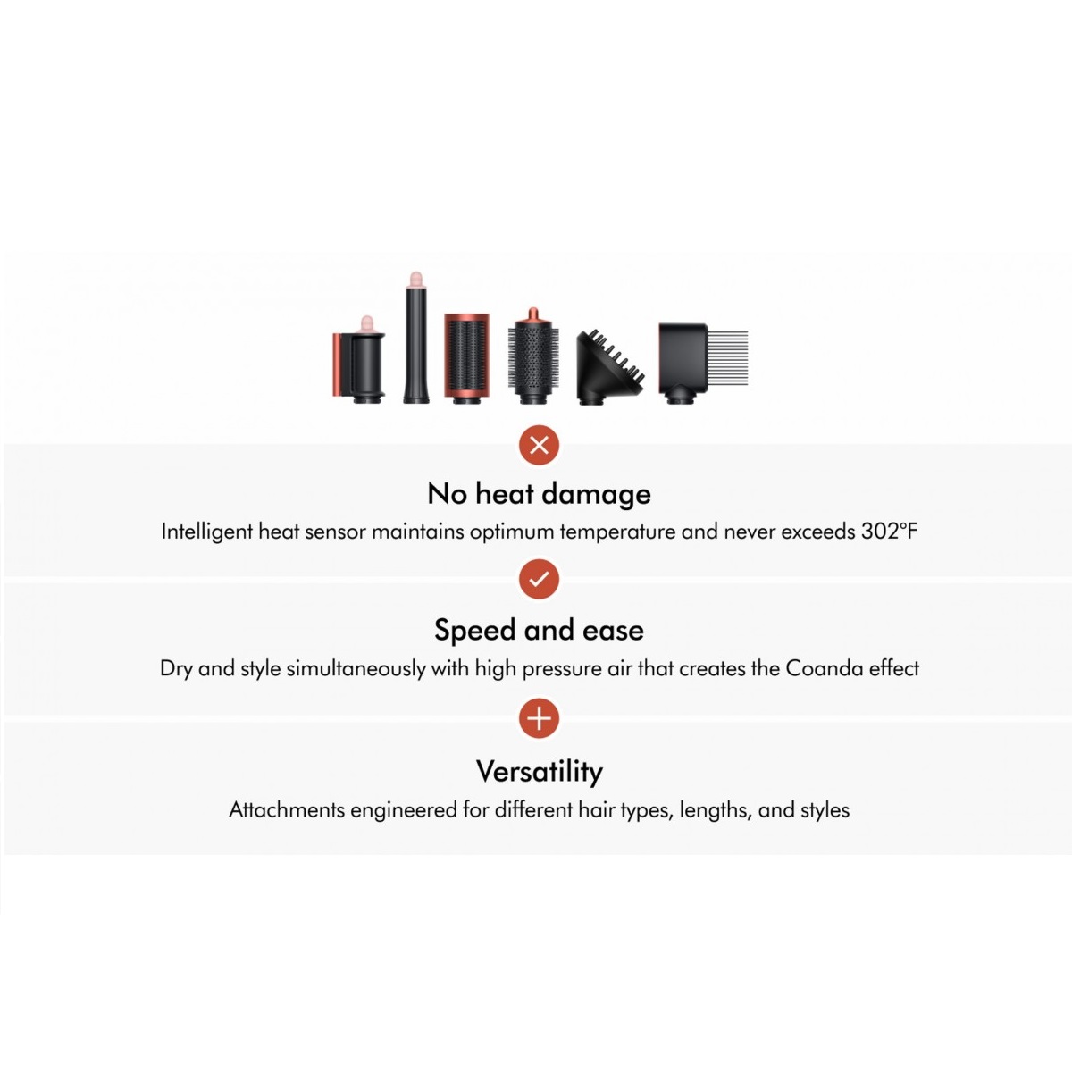| امکانات | طراحی ایرودینامیک (کاهش صدا و بهبود عملکرد), عدم آسیب حرارتی (حالتدهی با جریان هوا), فناوری Coanda (جذب مو به دور ابزار بدون نیاز به گیره), کنترل دمای هوشمند (مانیتورینگ برای جلوگیری از داغ شدن بیش از حد) |